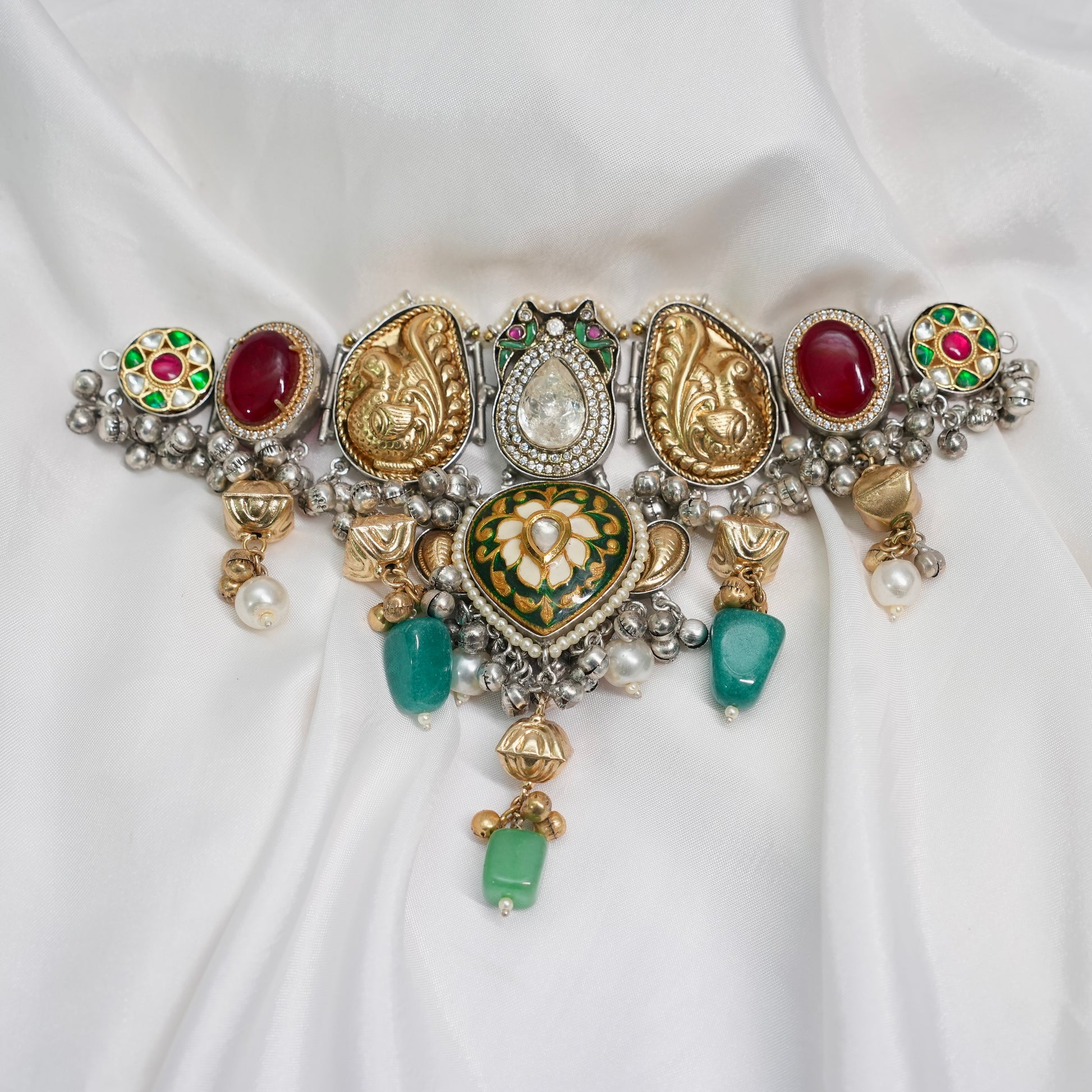 Material : Brass, Gold and silver Plating, Doublet Stone, Moissanite, Pachi Kundan, Ghungroo, American Diamonds, meenakari work .